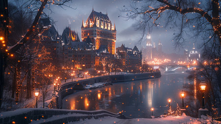 Quebec City, Canada: The view of Quebec City from the Saint Lawrence River at night, AI generative imaginary cityscape