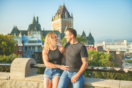 Quebec summer travel tourists couple in front of Frontenac Chateau, Old Quebec.