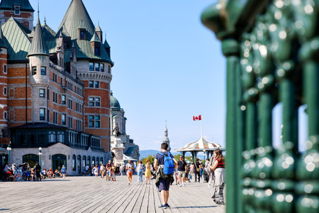 Montreal, QC, Canada - August 7, 2025: Tourists walking on Dufferin Terrace admiring the historic architecture of Ch