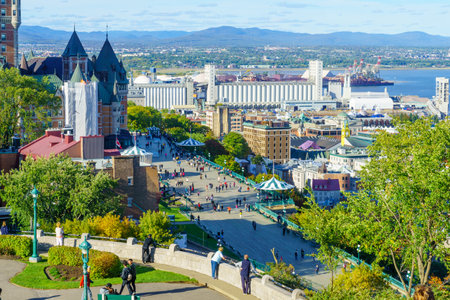 Quebec City, Canada - September 27, 2018: View of the lower town and the Dufferin Terrace from the citadel, with locals and visitors, Quebec City, Quebec, Canada