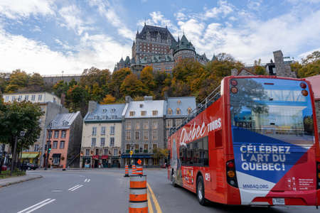 Quebec, Canada-October 19 2021: Quebec City tours bus and old town street view in autumn season.