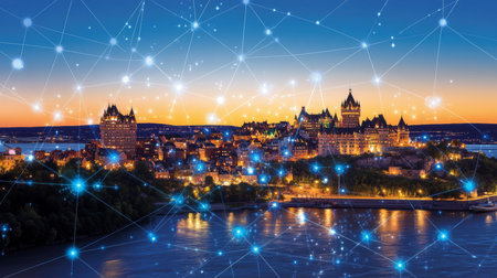 Historic Cityscape Illuminated at Twilight with Digital Network Overlay, Smart City Concept