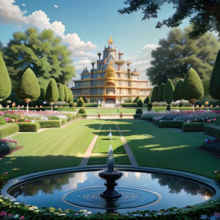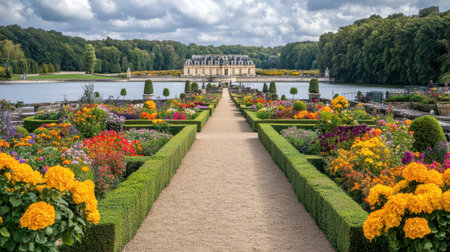 A formal French garden with vibrant flower arrangements, trimmed hedges, and an elegant stone pathway.