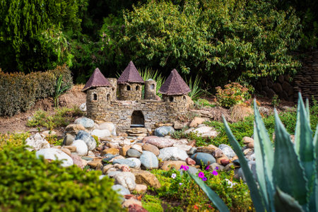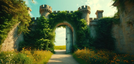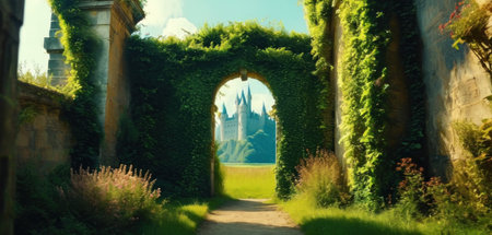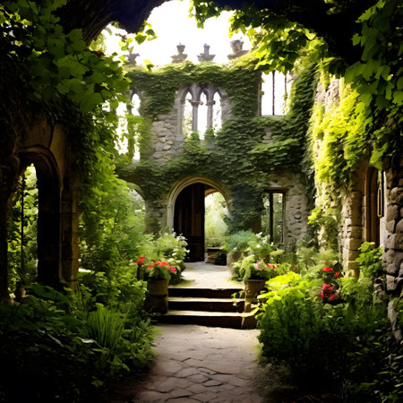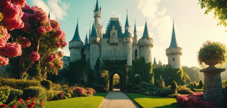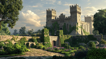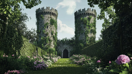 A stunning medieval castle with two towers stands in a lush garden. Overgrown vines and blooming flowers create a tranquil and enchanting atmosphere perfect for fairy tales.
