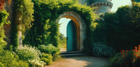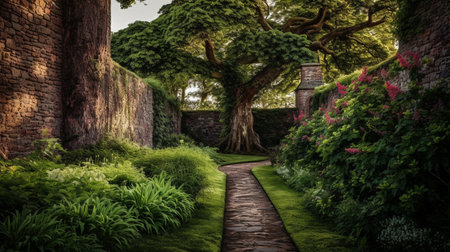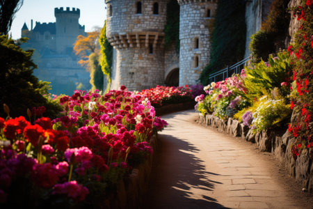 a hidden garden located behind the walls of an ancient castle. The garden is lush and vibrant, filled with colorful flowers and green foliage. The castle wall can be seen in the background