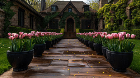 Beautiful pathway lined with pink tulips leads to elegant house surrounded by lush greenery and ivy. scene evokes sense of tranquility and charm, perfect for spring day