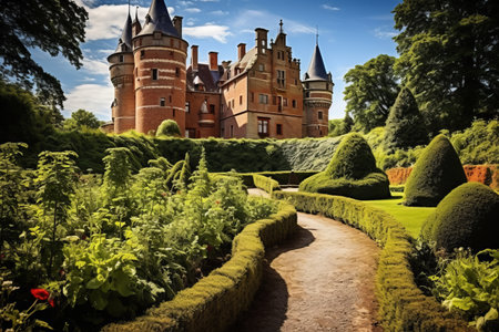 A historic castle with stone walls, a moat, and lush gardens, creating a picturesque and grand scene.
