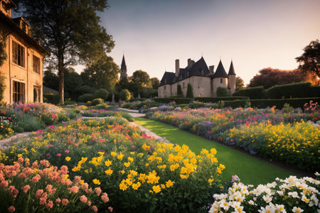 A formal garden with rows of blooming flowers leading to a classic French house, ideal for serene scenes.