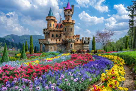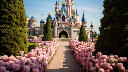 Panoramic view of beautiful fairy tale castle with pink flowers in garden