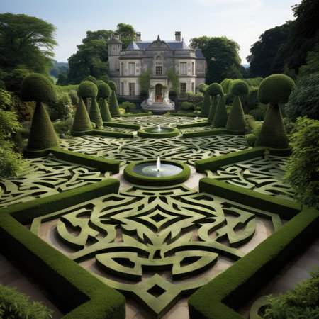 Captivating aerial perspective showcasing a meticulously crafted botanical garden featuring elaborate hedge designs and a tranquil fountain at its center.