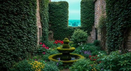 Enchanting garden courtyard with moss-covered fountain surrounded by vibrant flowers and ivy-covered walls on a tranquil summer day.