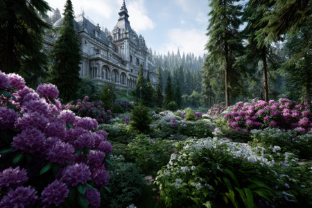 Vibrant flowers bloom in colorful patches around a majestic mansion nestled in a serene forest landscape.