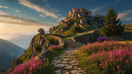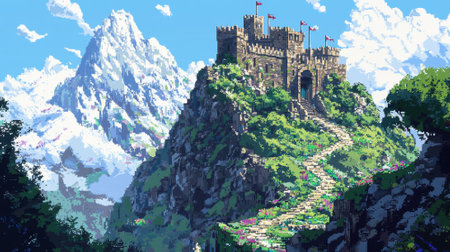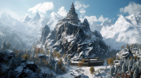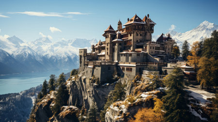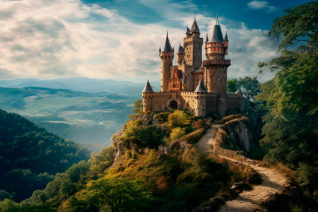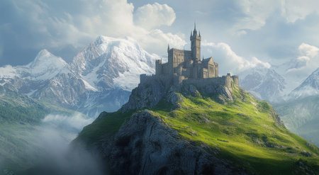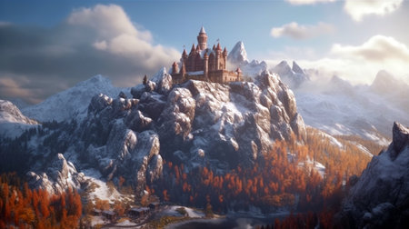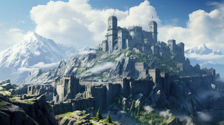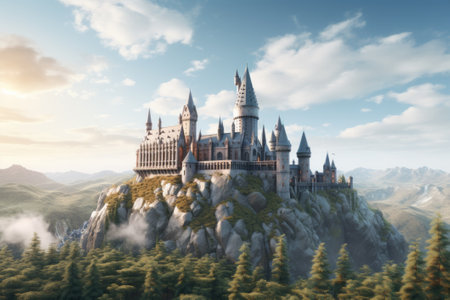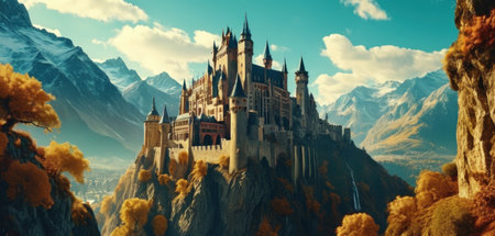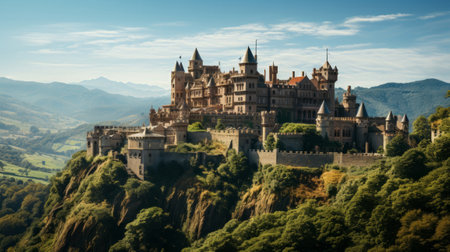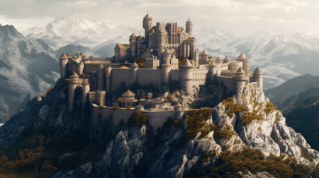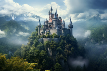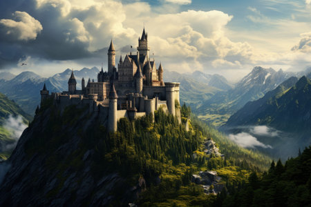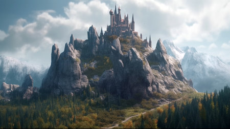 An AI generated illustration of a majestic castle atop a mountain surrounded by lush foliage and towering peaks, creating an awe-inspiring sight