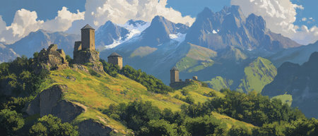 Ancient watchtowers nestled among the serene Georgian mountains with stunning peaks