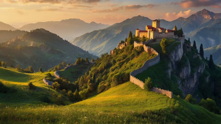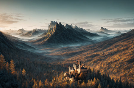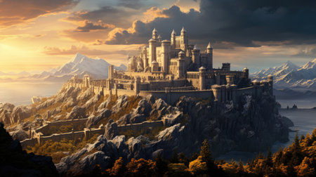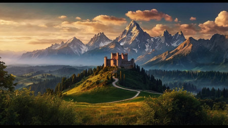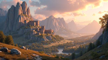 Generative AI : a castle in a mountain valley at sunset with a medieval atmosphere