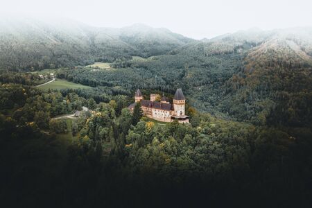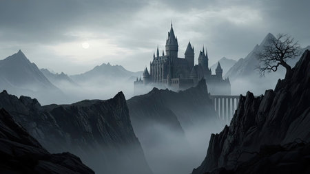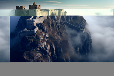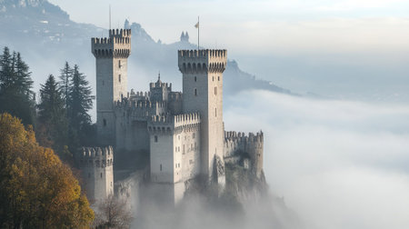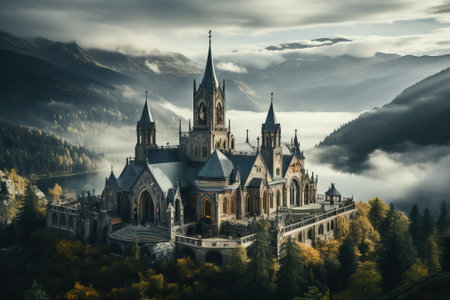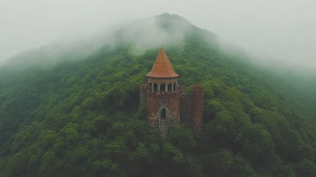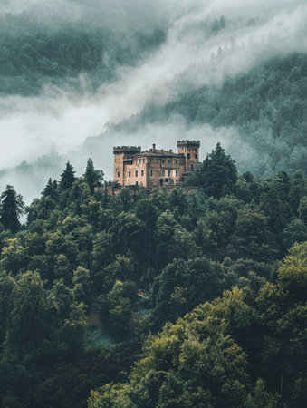 Majestic Ancient Castle Perched on a Misty Mountain Amidst Lush Forest Landscape Historic Medieval Fortress Shrouded in Atmospheric Fog with Moody Mysterious Ambiance