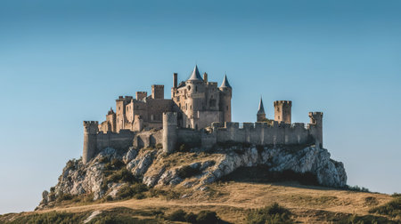 Ancient castle stands majestically on hilltop under clear sky, creating a calm atmosphere with space for personal text or quotes.