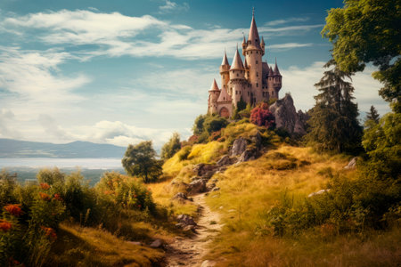 A castle sitting on top of a lush green hillside. Generative AI image.
