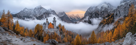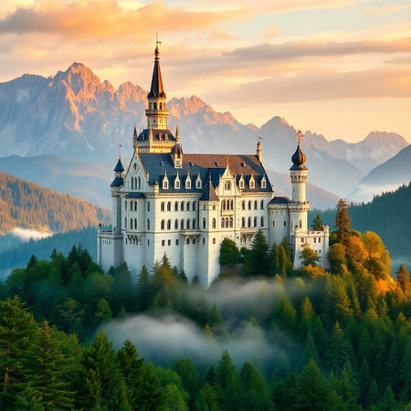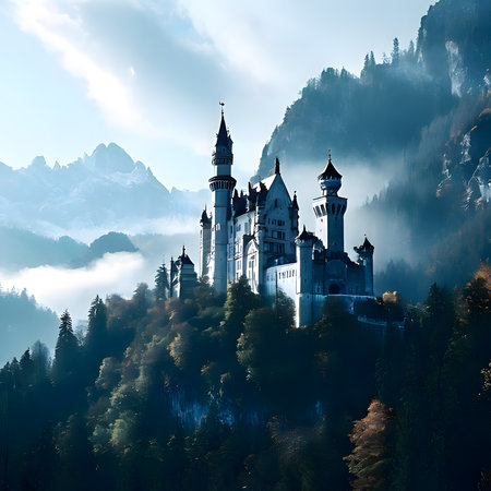 Magical Neuschwanstein Castle perched in misty mountains offers a fairytale landscape experience for tourism