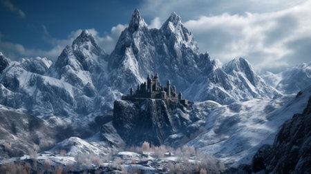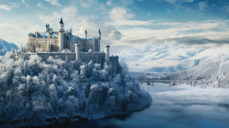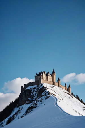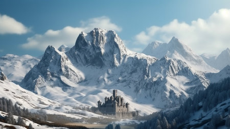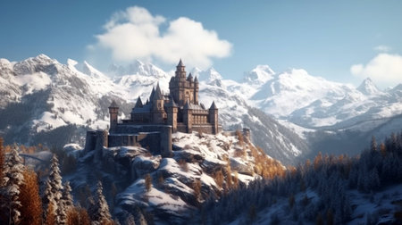 A grand medieval castle stands proud against a backdrop of snow-capped peaks. The winter landscape glistens in sunlight, creating a serene and picturesque scene.