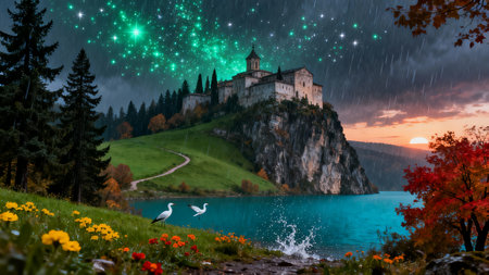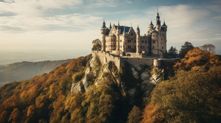 As the sun sets, a majestic medieval castle stands proudly on a cliff, surrounded by vibrant autumn foliage and a sprawling valley beneath a colorful sky.