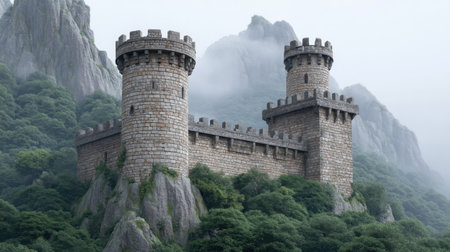 A breathtaking stone castle rises amidst a misty mountain backdrop, surrounded by vibrant greenery. This enchanting scene evokes a sense of history and adventure.