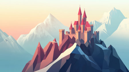 A stunning illustration of a castle perched on a mountain peak, enveloped by snow-capped mountains under a soft pastel sky, creating an enchanting fantasy landscape.