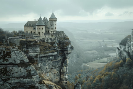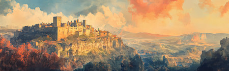 A castle from the medieval era sits atop a cliff, overlooking a dramatic landscape, A medieval castle perched on a cliff overlooking a vast kingdom