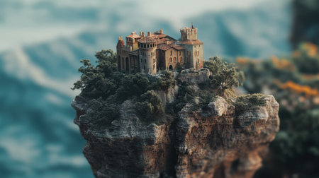 A small house is built on top of a rocky mountain. The house is surrounded by trees and has a castle-like appearance. The scene is peaceful and serene