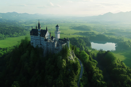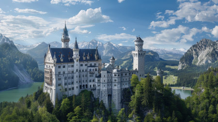 Majestic neuschwanstein castle amidst lush greenery and scenic backdrop of rolling fields and lake