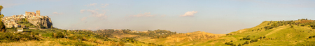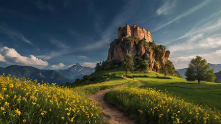 Beautiful panorama of the medieval castle on the hill with yellow flowers