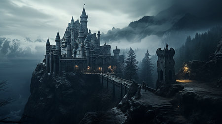Mysterious Castle medieval mountain. History ancient view. Generate AI
