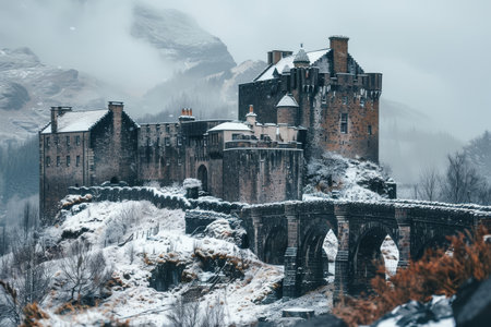 The majestic castle stands proudly on a rocky outcrop, blanketed in snow, as mist envelops the surrounding mountains on a serene winter day.