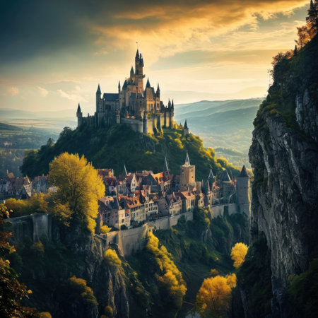 An ancient castle perched on a hilltop glows in golden hues as dusk approaches, offering a perfect backdrop for your ideas.