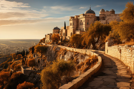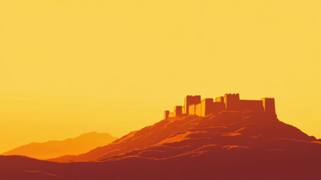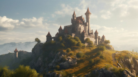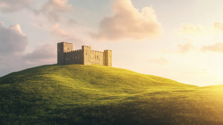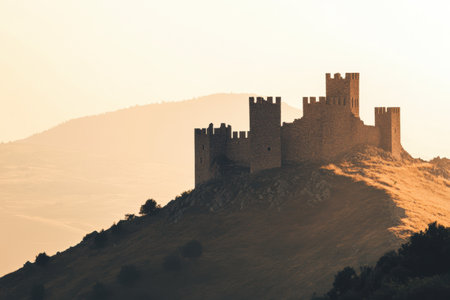 An ancient castle perches on a hilltop bathed in warm sunlight, offering tranquility and a panoramic view. Perfect backdrop for any project.