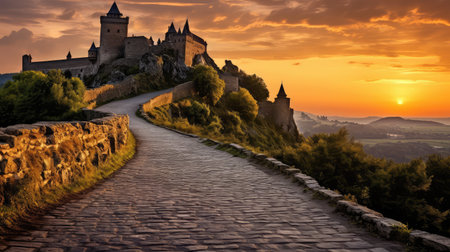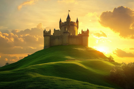 A medieval castle sits majestically on a green hill while the sun sets, casting a golden hue across the landscape and enhancing the beauty of nature.