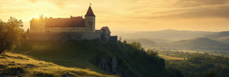 An ancient castle stands majestically on a hilltop, bathed in soft sunlight during sunset. The landscape showcases rolling hills and serene beauty.