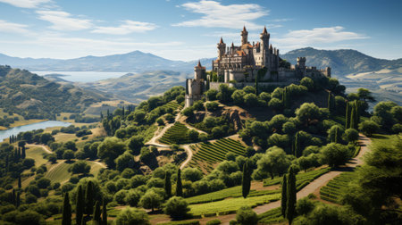 This image features a majestic medieval castle atop a scenic hillside, flanked by robust stone walls and surrounded by lush greenery, beneath a bright blue sky interspersed with clouds. AI generated image