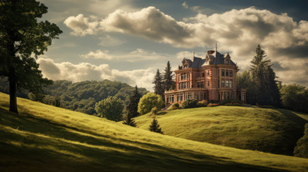 A castle sitting on top of a lush green hillside. Generative AI image.