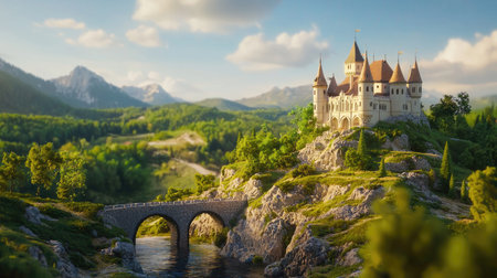 A stunning landscape featuring a majestic castle perched atop a hill, surrounded by lush greenery and majestic mountains, with a serene river flowing beneath a charming stone bridge.