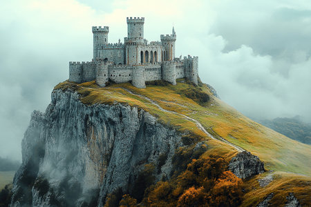 A breathtaking stone castle rises amidst a misty mountain backdrop, surrounded by vibrant greenery. This enchanting scene evokes a sense of history and adventure.