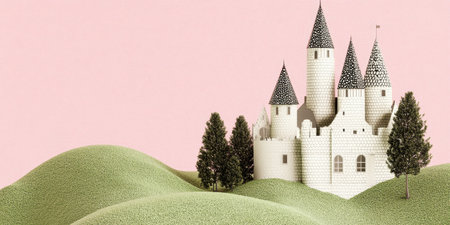 Enchanting castle illustration with pastel landscape and minimalist design.