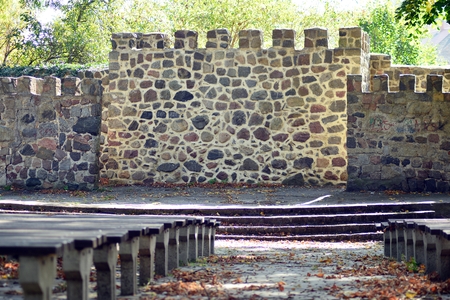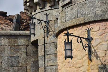 Przemysl Castle or Casimir Castle, XIV century is a renaissance castle in Przemysl, Poland. It located on the Castle Hill. View of the defensive stone wall with lanterns of the Przemysl citadel.