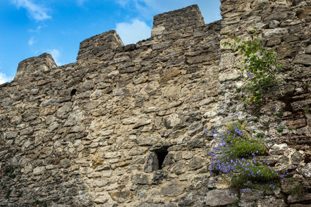 natural stone fortification wall and wild bluebell flowers on the wall. Mount Bona in Kremenets, Ternopil region, Ukraine.