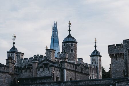 London, UK - June 22, 2019: Low angle view of Shard behind Tower of London, against the sky, during blue hour. Tower of London and Shard is are one of the most popular landmarks in London.