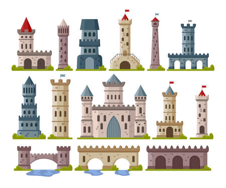 Medieval stone towers cartoon illustration set. Castles or palace with gates, old historic fort with flag, fairy tale buildings, elements for computer game. Fantasy, ancient architecture concept