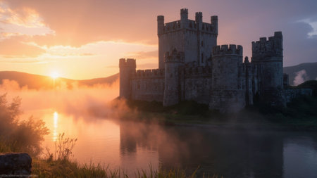 Dramatic sunrise illuminating medieval castle shrouded in fog