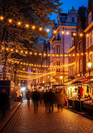 A bustling outdoor market at dusk with people walking along a cobblestone street lined with festive lights and stalls