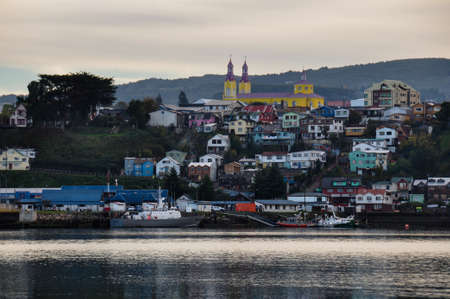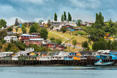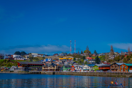CHILOE, CHILE - SEPTEMBER, 27, 2018: Beautiful outdoor view of wooden house buildigs in the horizont of chonchi harbour in Chiloe island Chile