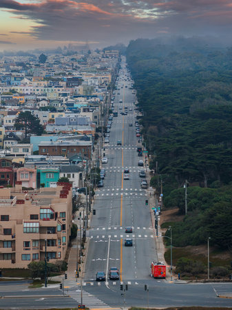 SAN FRANCISCO, CA - October 22, 2021, View of one of the many streets in the Sunset area, in bright sunny weather, photograph processed in pastel colors.